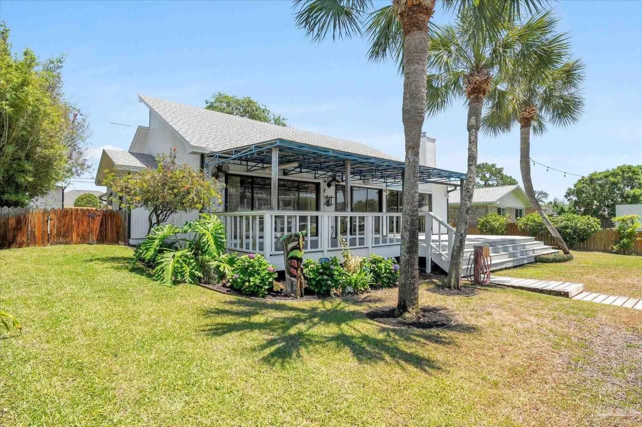 Boaters Delight with 80 feet of Canal Frontage. Boat house with utilities and boat lift. Contemorary home with catheral ceiling , wood floors, stainless steel appliances and fabulous view. Light, Bright and open floor plan with lots of room for entertaining in or outside on the generous deck. Master Bedroom and one additional bedroom have en suite bathrooms. Enjoy community tennis courts, nearby Bike Path and park. Short trip to Pensacola Beach by Boat or auto.